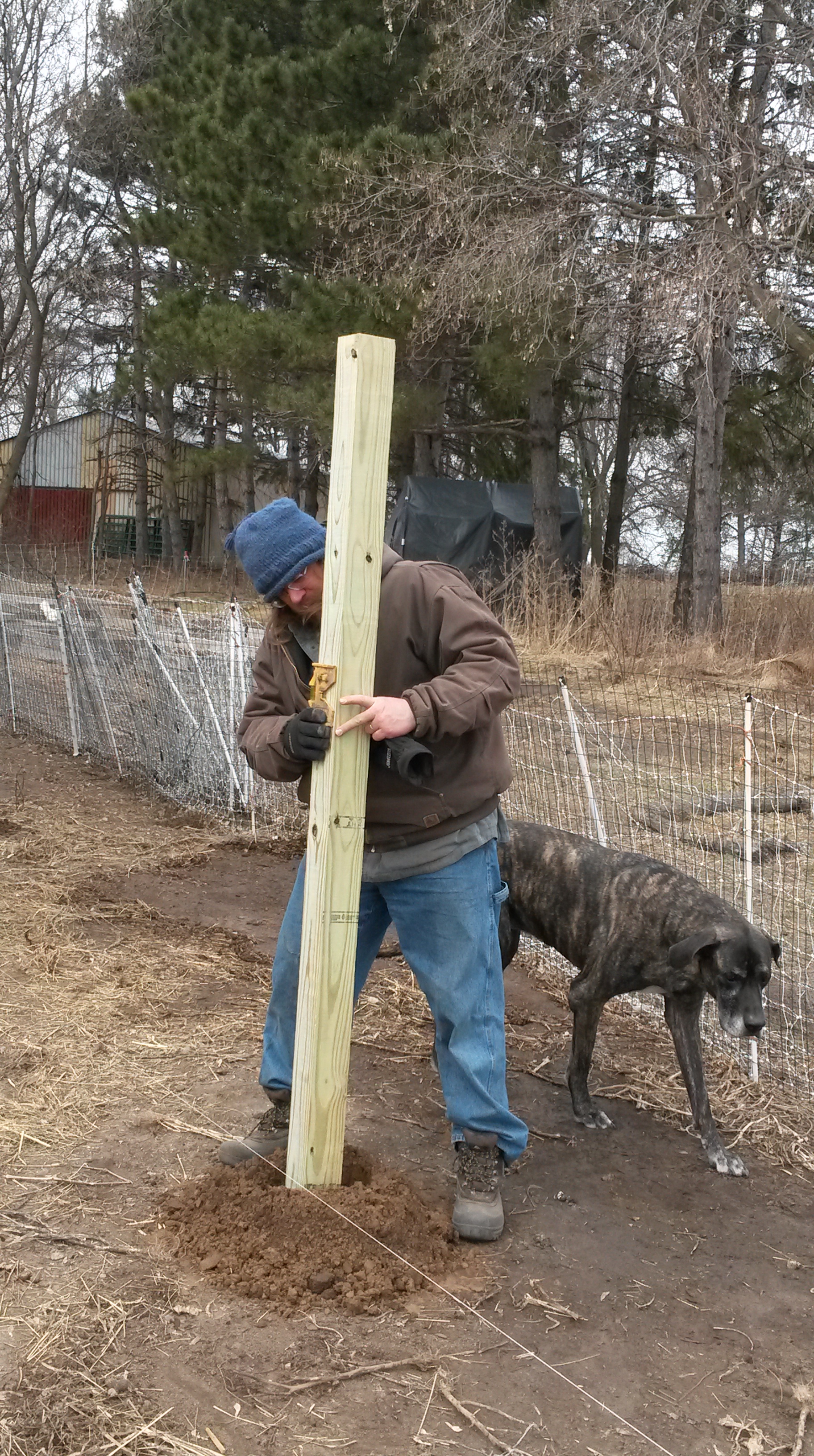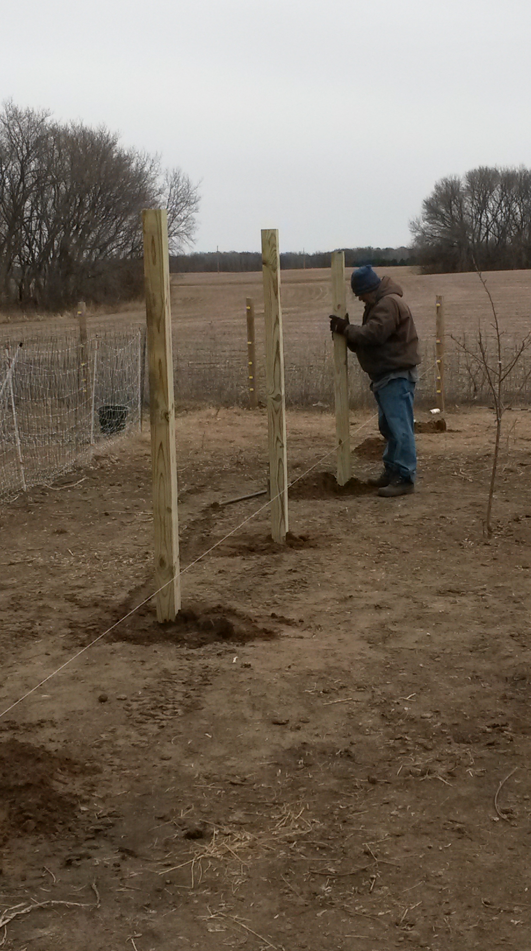 Originally we bought cedar posts. Then we looked at the receipt…and exchanged them for treated ones, which cut our costs by about 2/3. When 50 posts cost you $500 and not $1500, you feel a whole lot better about a lot of things. As I am not pitting vegetable beds right next to the posts, it should be safe enough. Besides, you do the best you can in being natural and chemical free. I wish we could do cedar, but the price is just too high! Moving on.