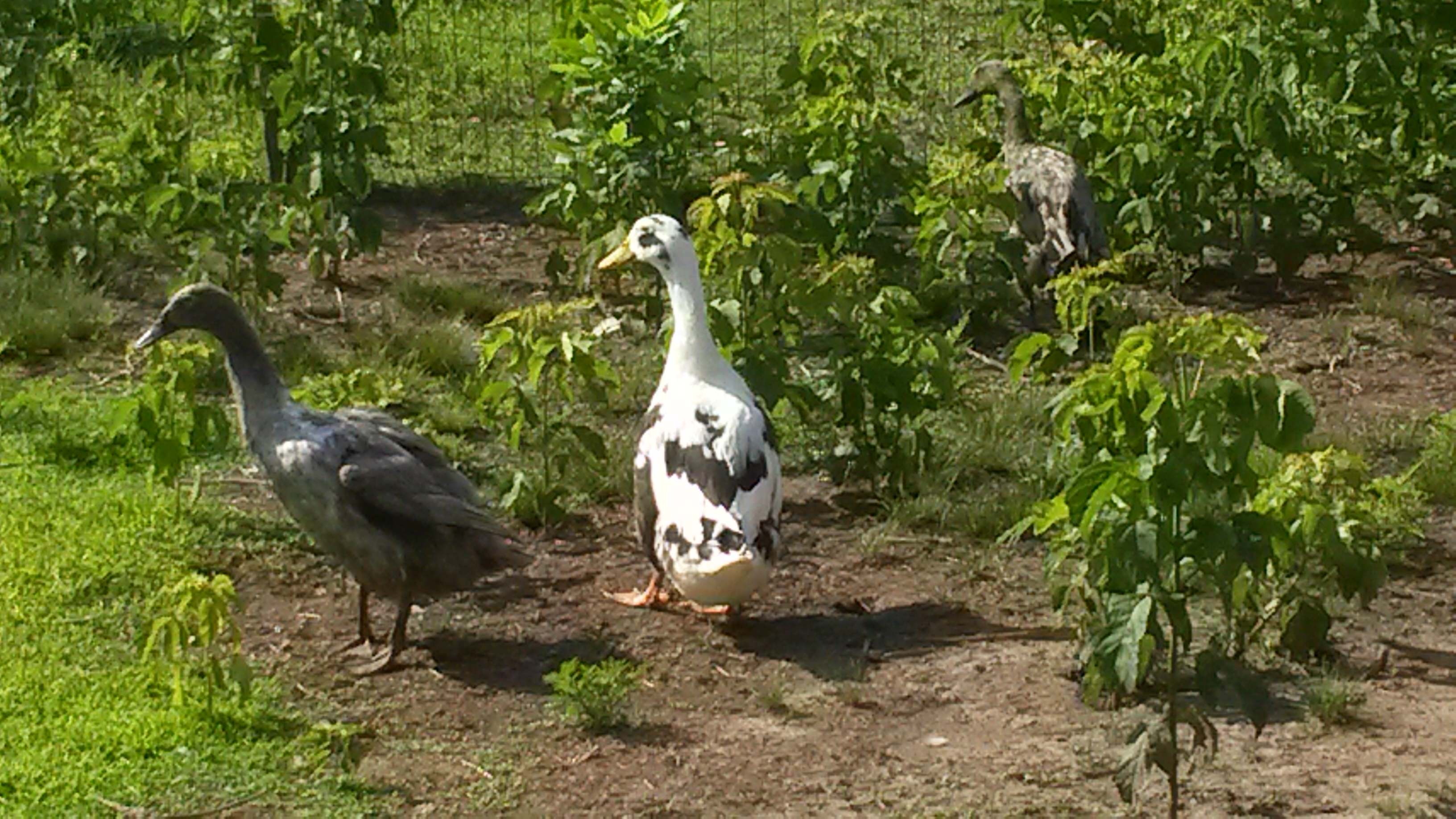 We have horses, sheep, potbelly pigs, four types of chickens and two runner ducks (hatched April 2014). In April 2015 we added two Pilgrim geese, Dill and Lill, from Metzer Farms hatchery. And in June 2015 we bought an Ancona drake, Mr.Darcy, to keep company to the Blueberry Ladies, the Runners.